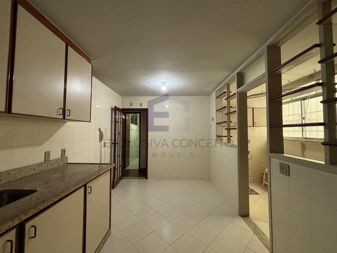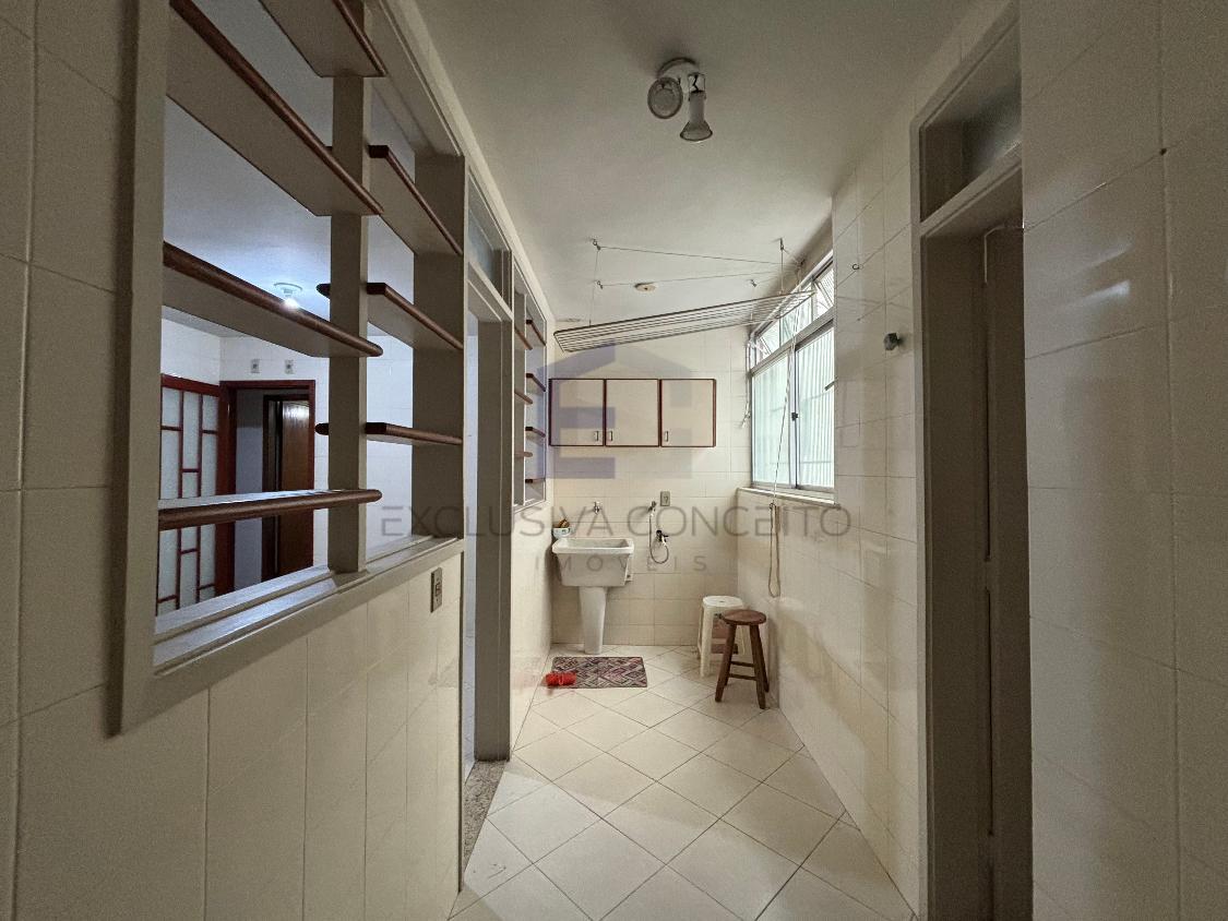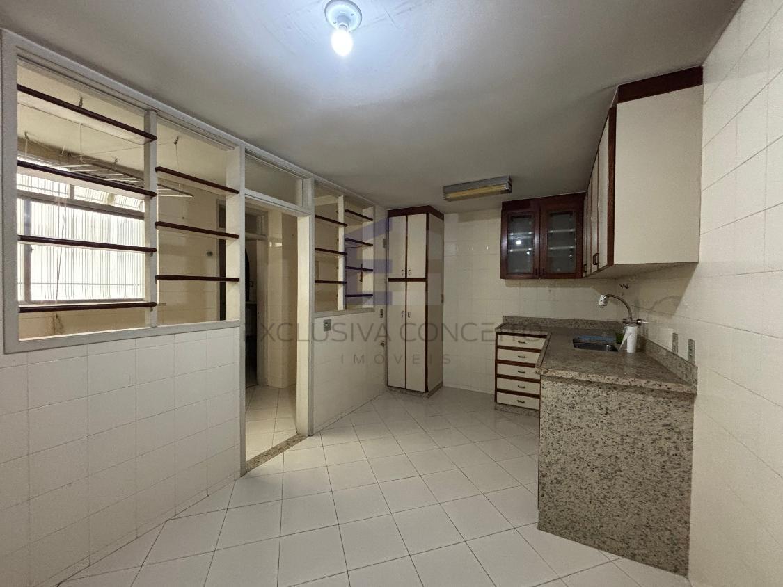 São 03 quartos, sendo 01 suíte, sala muito ampla em dois ambientes, rouparia no corredor, copa/cozinha, área de serviço ventilada e dependência completa.