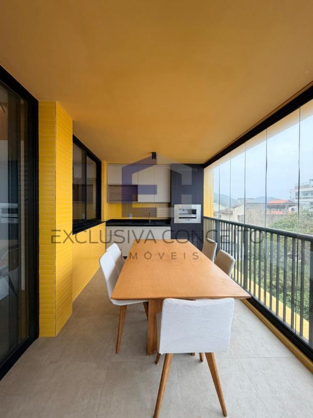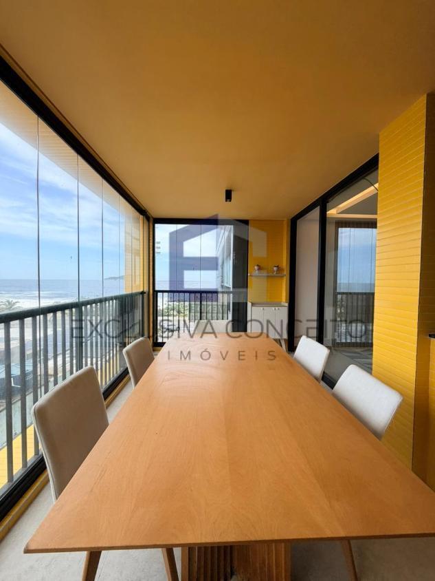 A varanda gourmet é um dos grandes destaques do imóvel: equipada com mesa de madeira, cinco cadeiras, bancada com churrasqueira elétrica e cortina de vidro, oferece uma vista indevassável para o mar, perfeita para momentos especiais.
