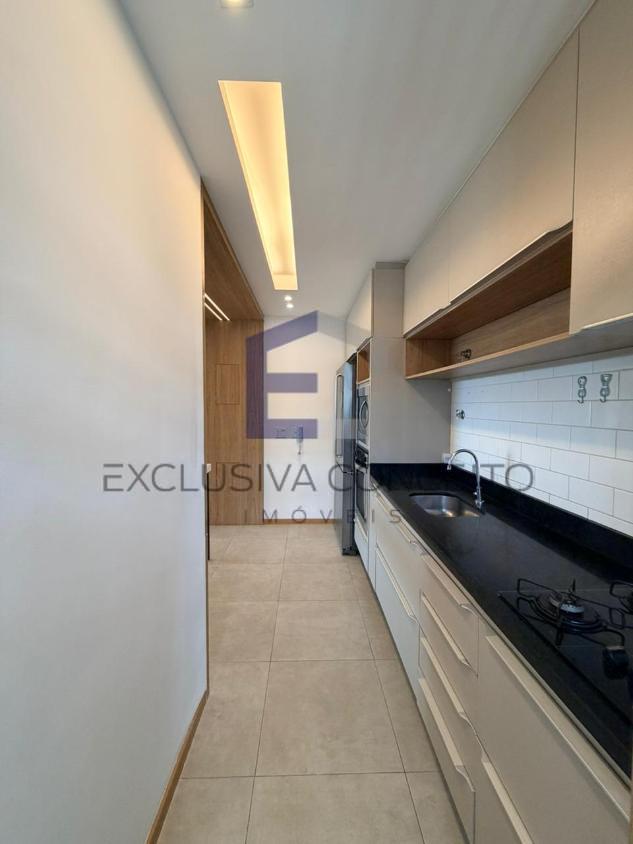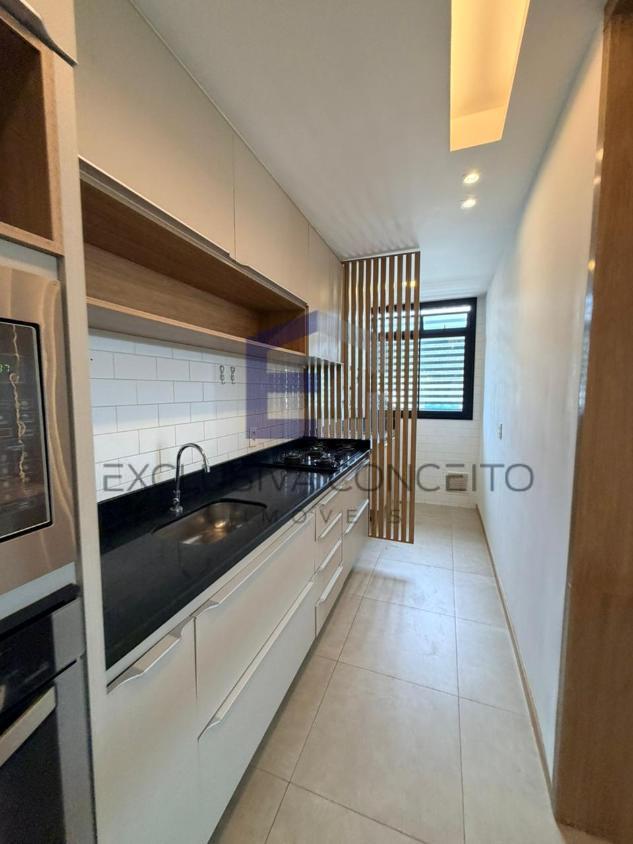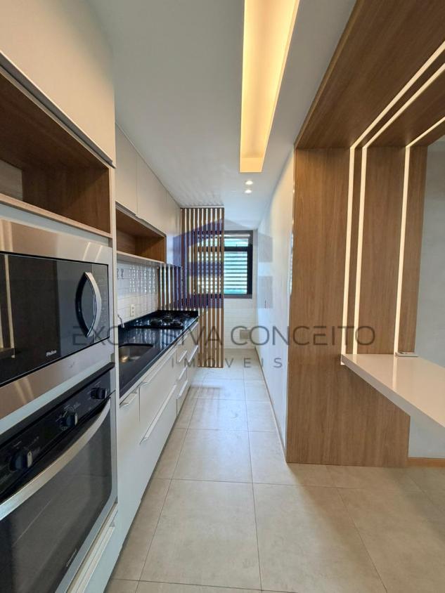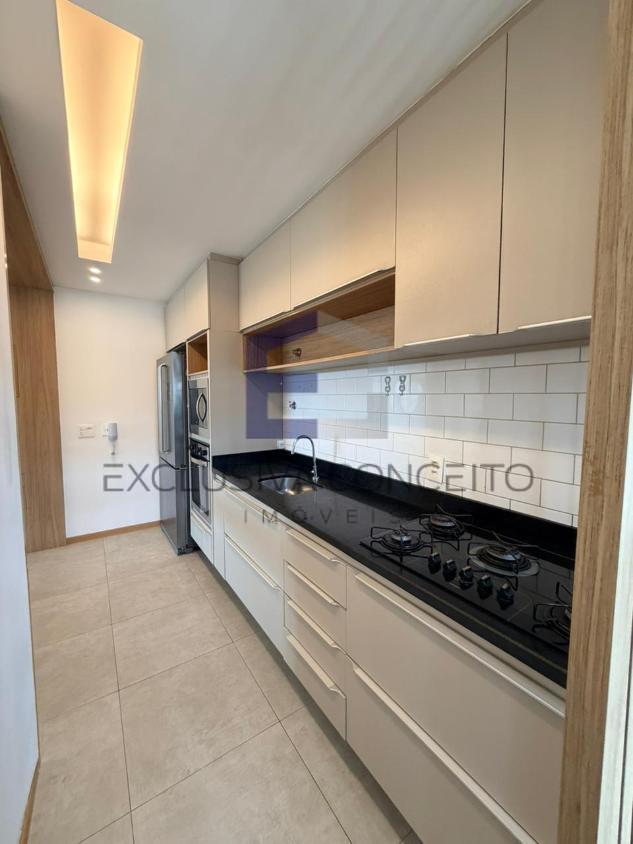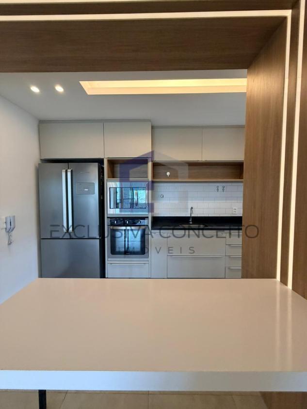 A cozinha moderna e funcional é equipada com geladeira side by side, forno e microondas embutidos, pronta para o dia a dia.