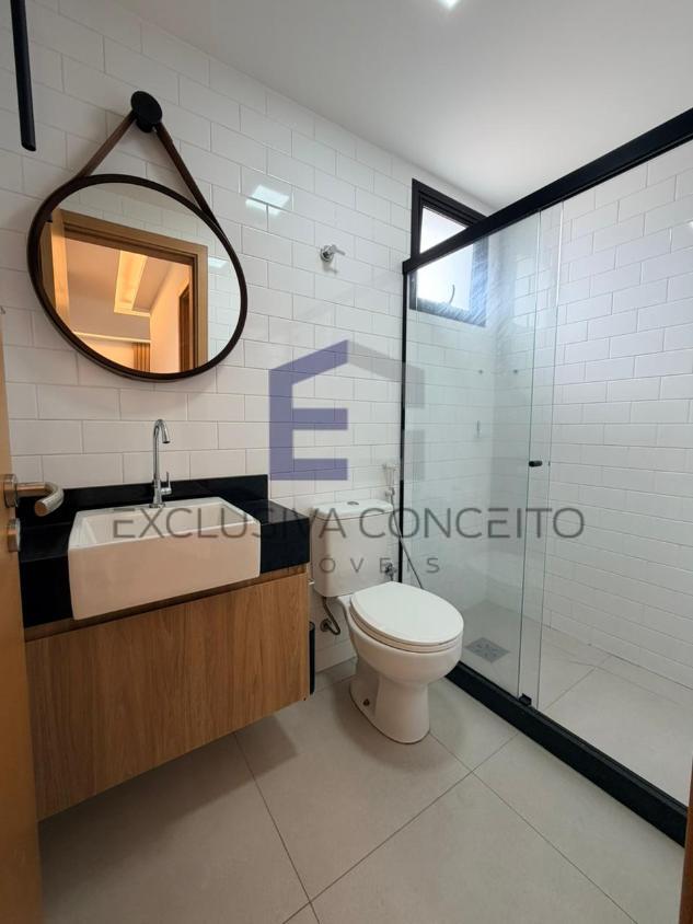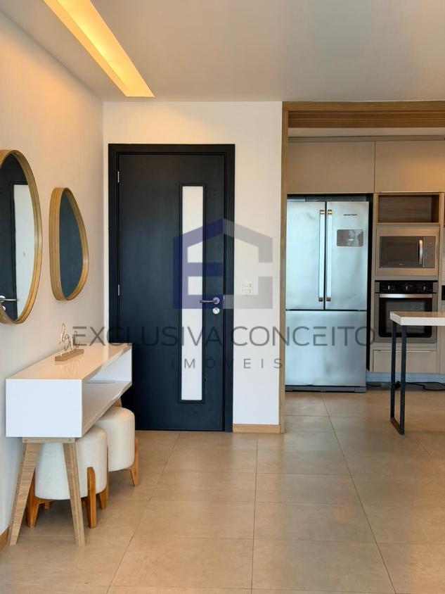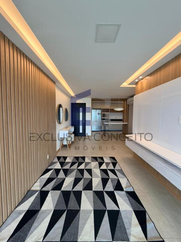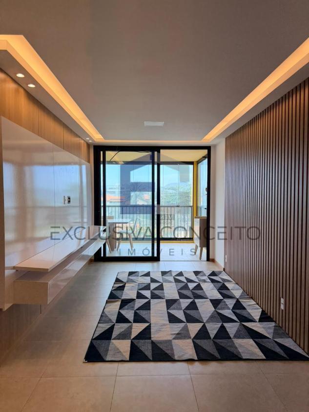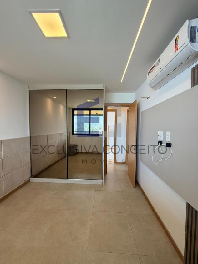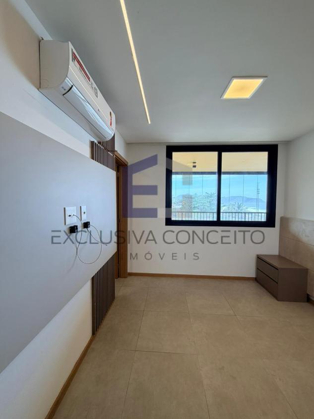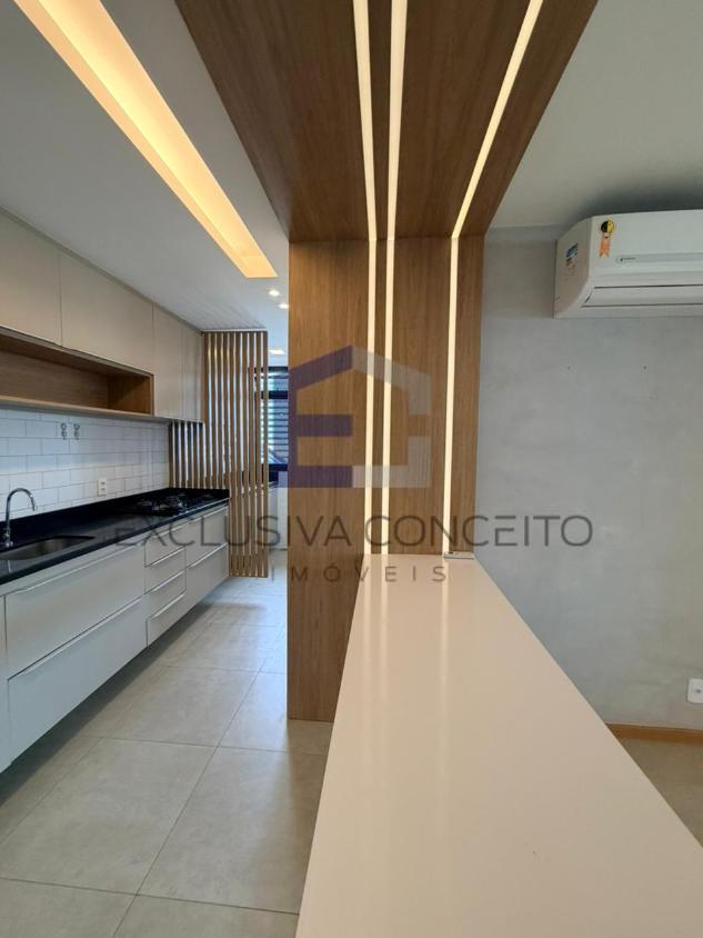 A sala ampla, integrada à cozinha, possui rack, luminária e ar-condicionado split em todos os ambientes, garantindo conforto térmico e elegância.