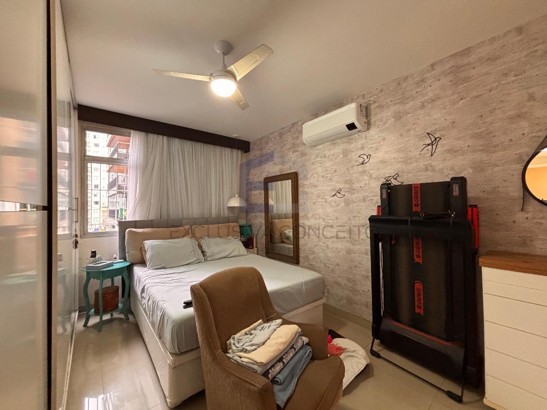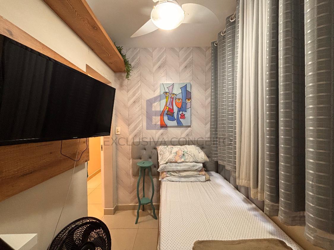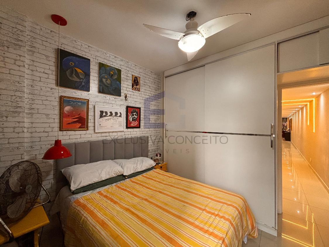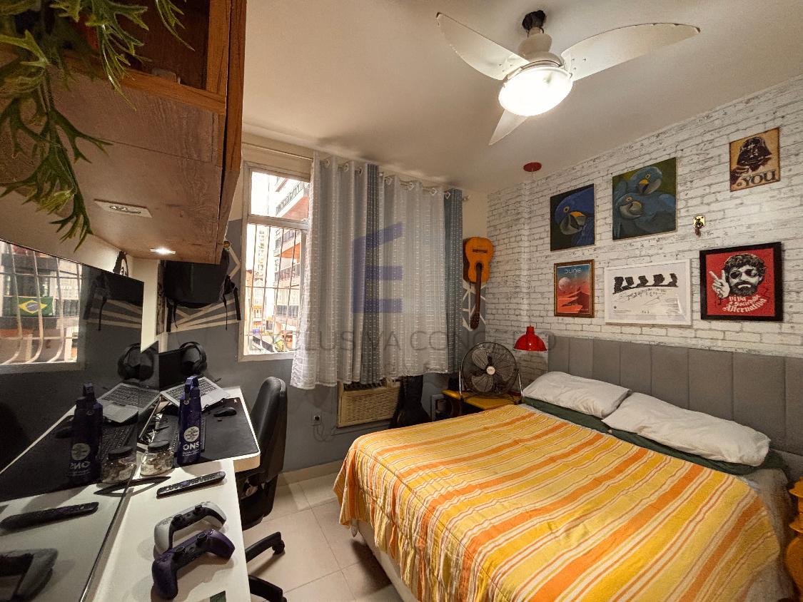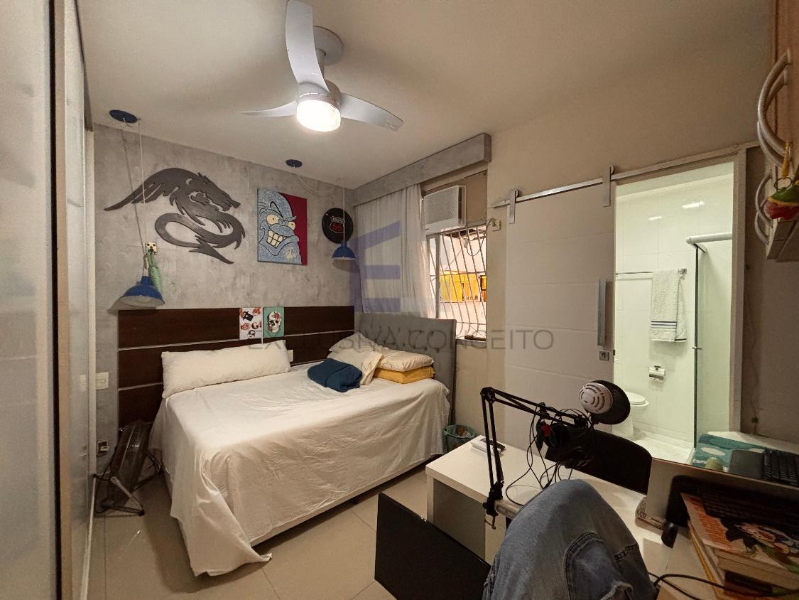 O apartamento possui 03 quartos, sendo 02 suítes. A dependência foi revertida em escritório (atualmente, apesar do tamanho mais reduzido, é utilizado como quarto e comporta uma cama tamanho solteiro e um roupeiro).