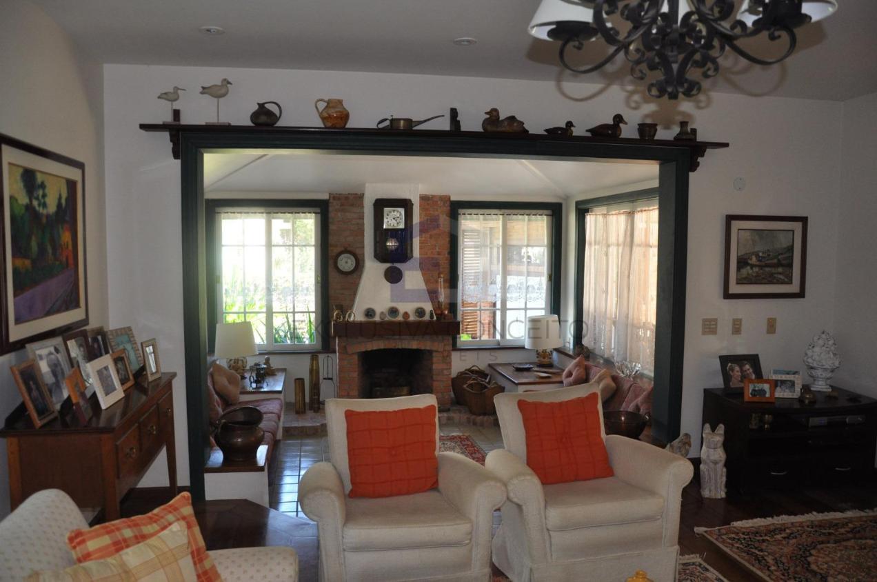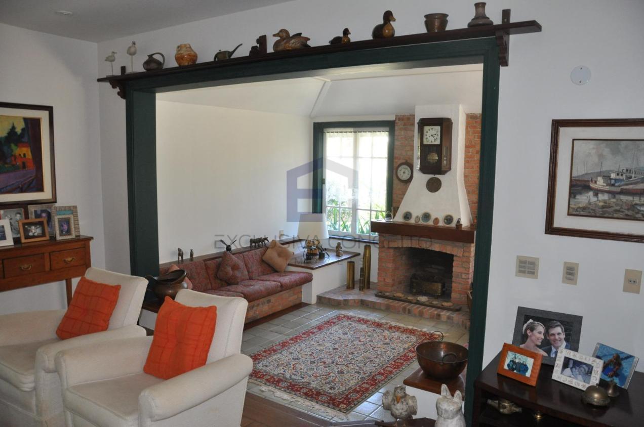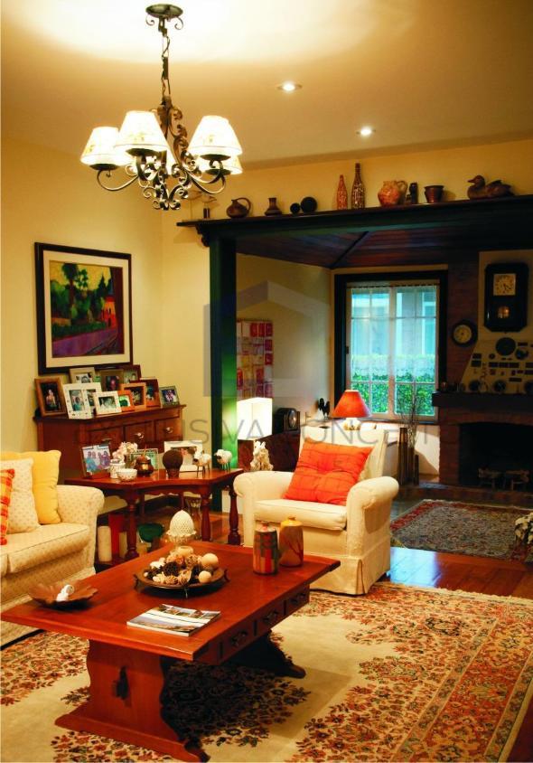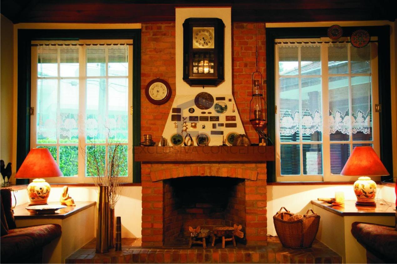 No 1º pavimento, encontra-se um salão dividido em dois ótimos ambientes, sala de jantar, lareira, lavabo, varanda, quarto com possibilidade de transformar em suite, banheiro social, copa-cozinha, 2 despensas, área de serviço, escritório, piscina, churrasqueira, cozinha gourmet, forno a lenha, sauna, jardim, garagem para até 6 carros e depósito.
