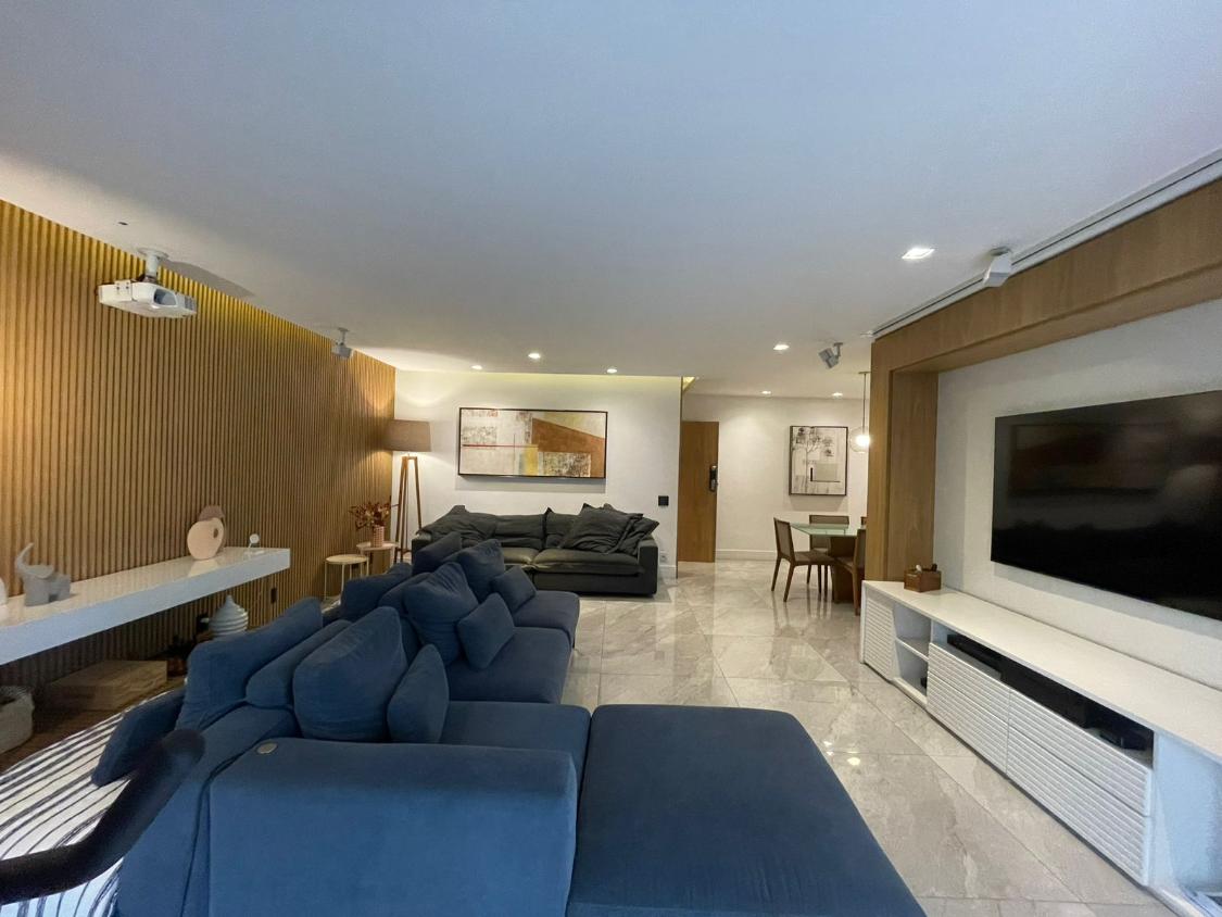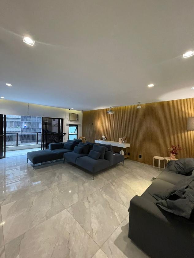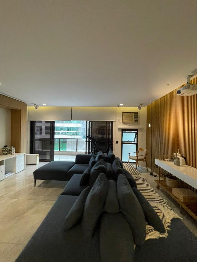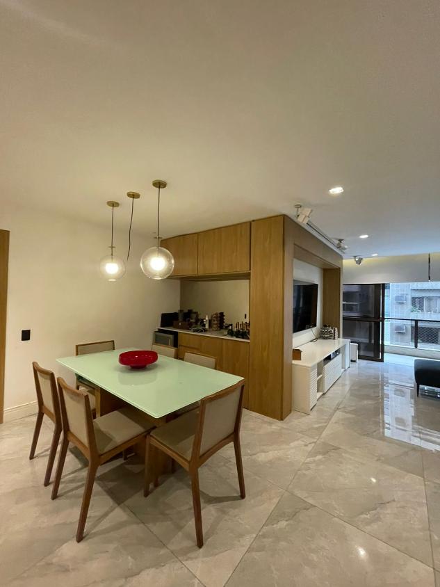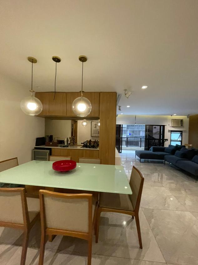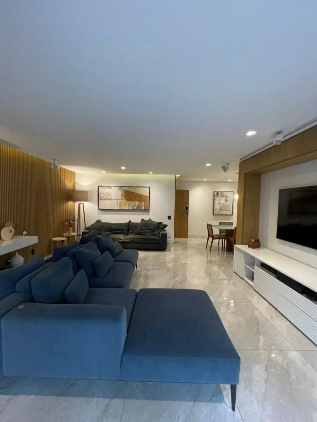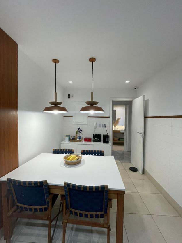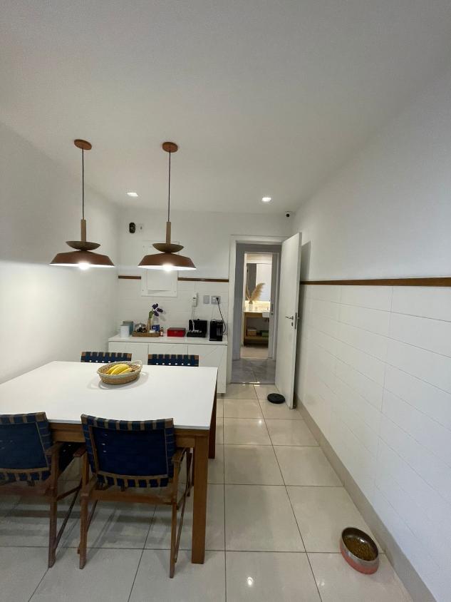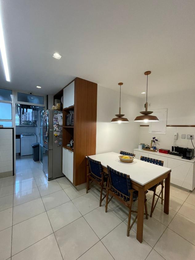 Sala de estar em 2 ambientes (40m2 jantar e estar), lavabo, banheiro social, varanda com vista lateral mar, hall privativo, copa/cozinha ampla com grande área de serviço e dependência completa de empregada.