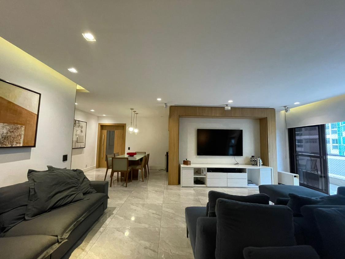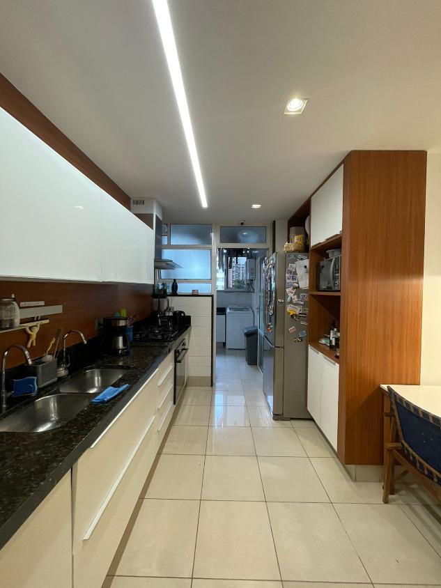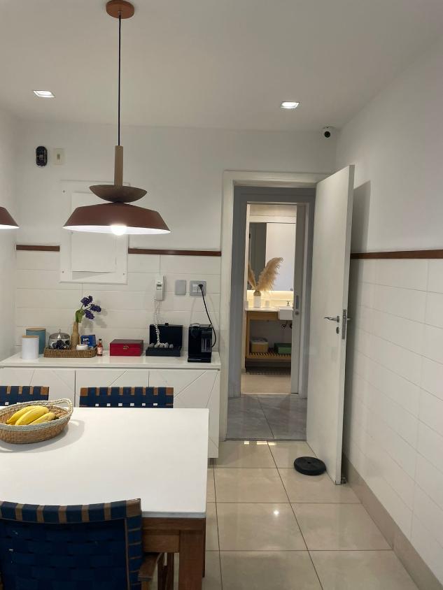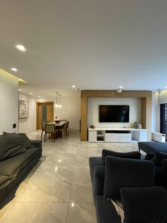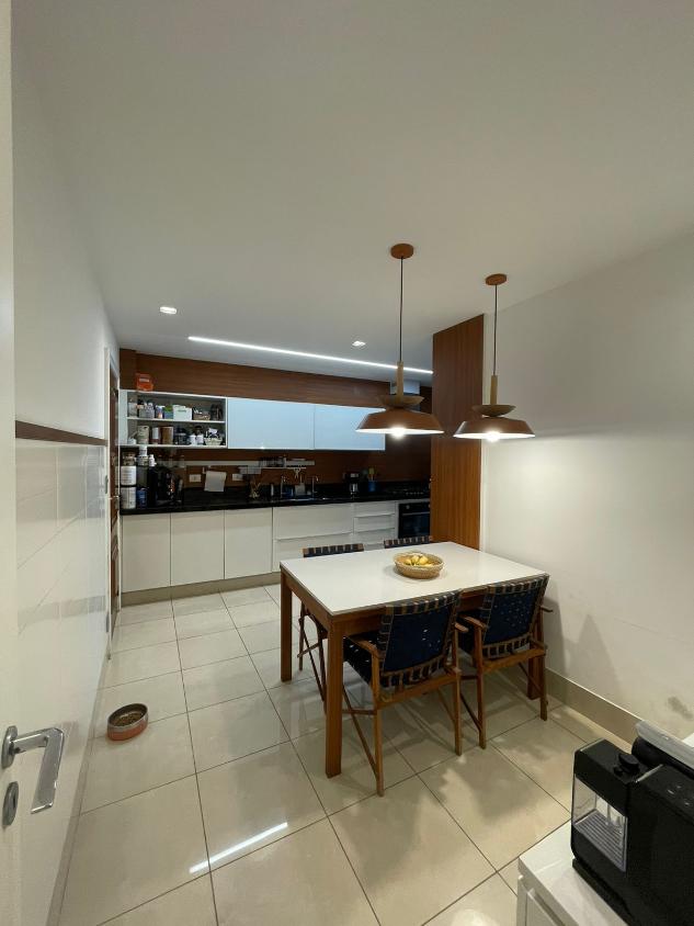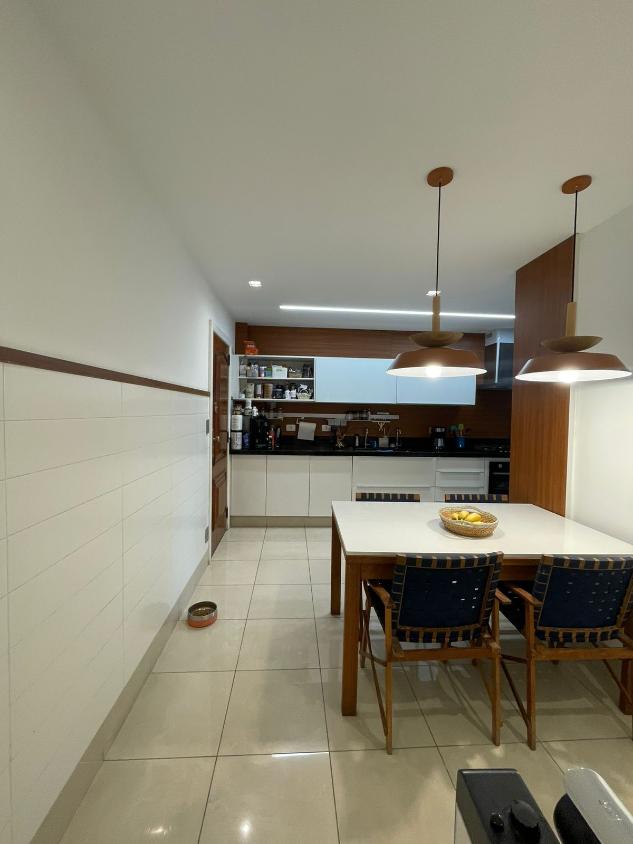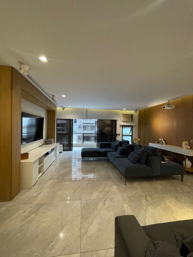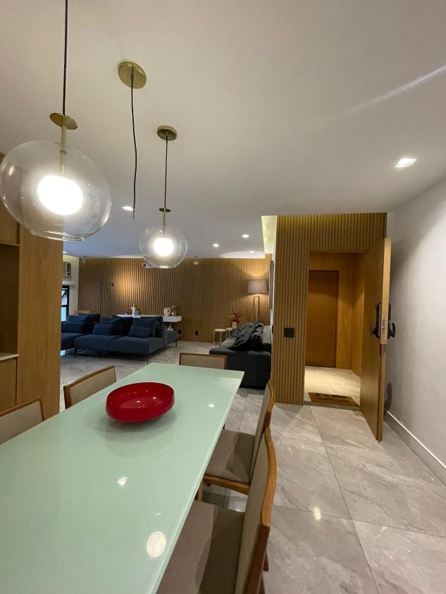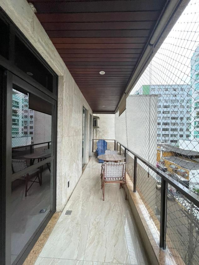 Sala de estar em 2 ambientes (40m2 jantar e estar), lavabo, banheiro social, varanda com vista lateral mar, hall privativo, copa/cozinha ampla com grande área de serviço e dependência completa de empregada.
